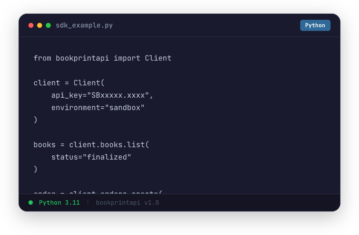 포토북 생성부터 주문/배송까지 전체 API를 지원하는 Python SDK입니다. pip install -e .으로 설치하거나 소스를 직접 임포트하여 사용할 수 있습니다.
